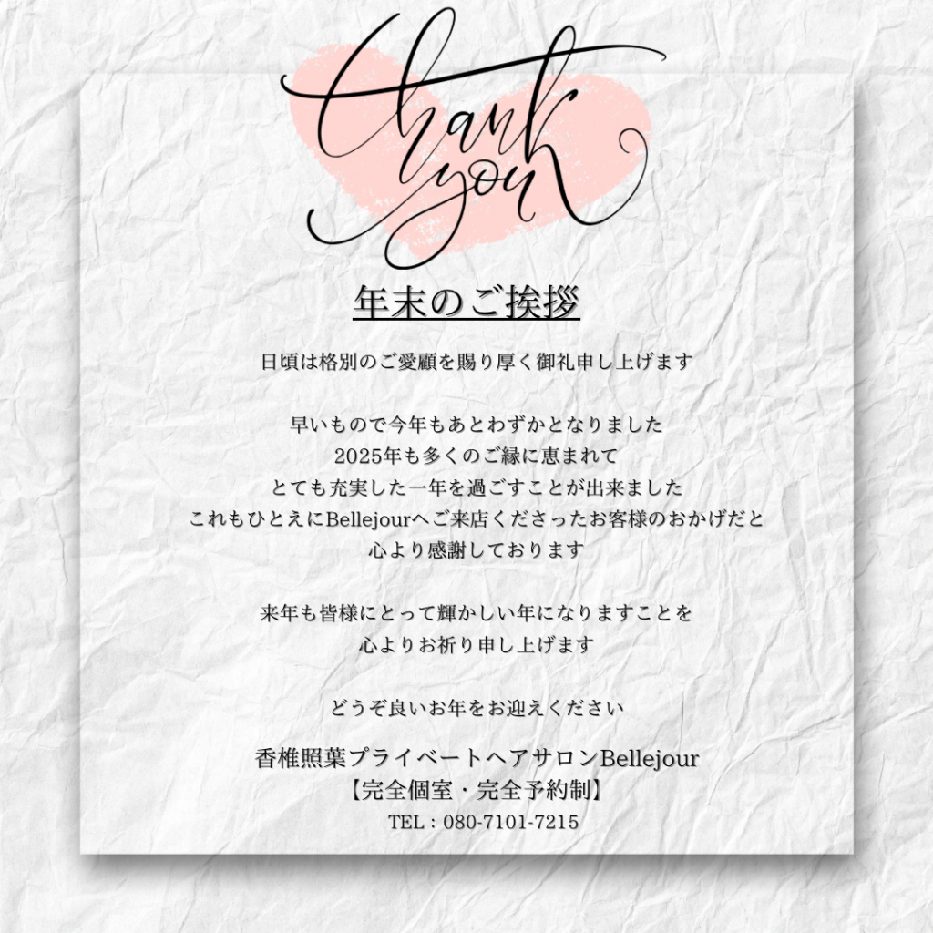 早いもので今年もあとわずかとなりました。2025年も多くのご縁に恵まれて、とても充実した一年を過ごすことが出来ました。これもひとえにBellejourへご来店くださったお客様のおかげだと心より感謝しております。